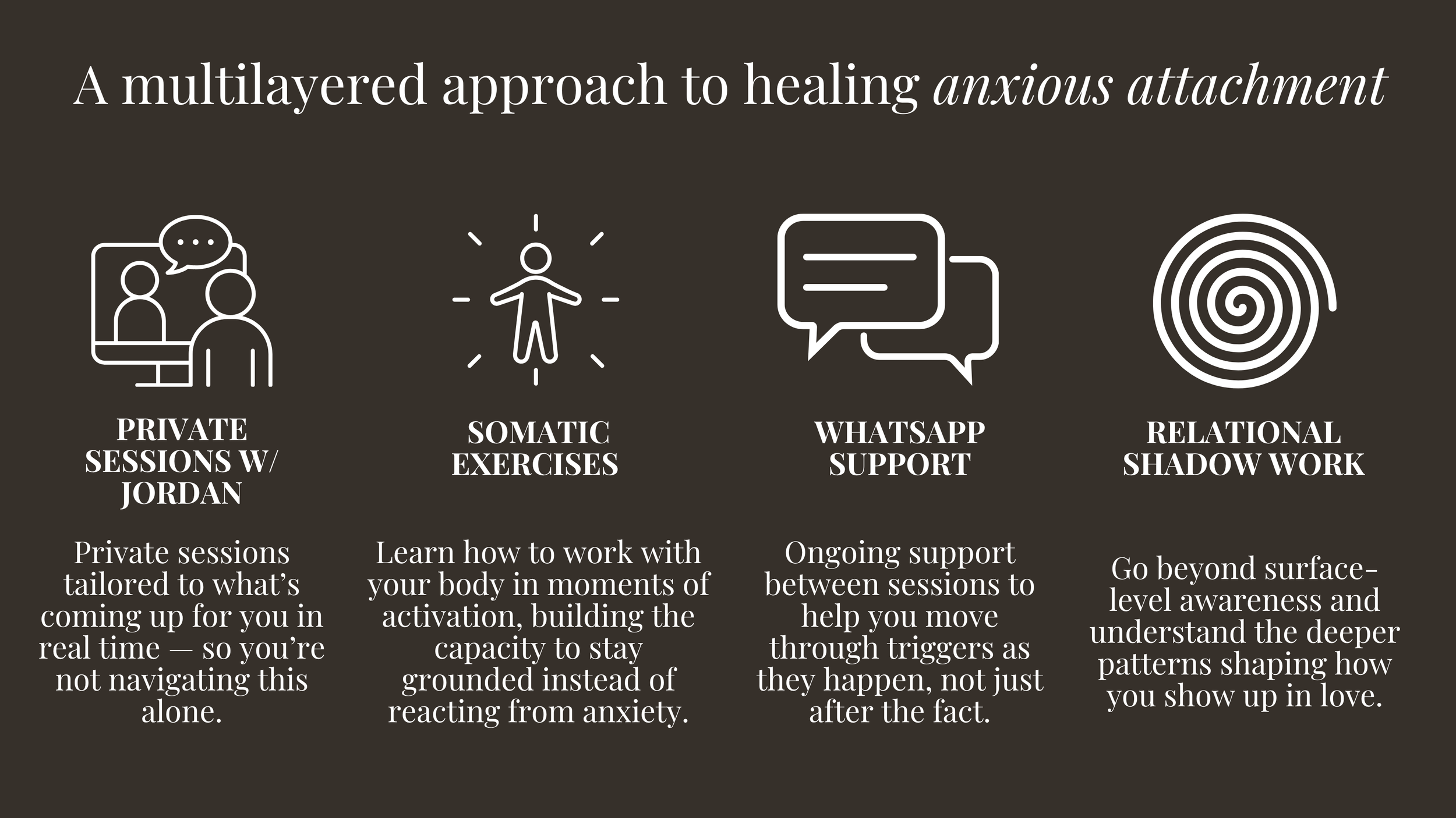 Each 90-minute call is a space where we work directly with what’s coming up for you in real time — whether that’s overthinking, fear of abandonment, or feeling like you’re too much in your relationships.